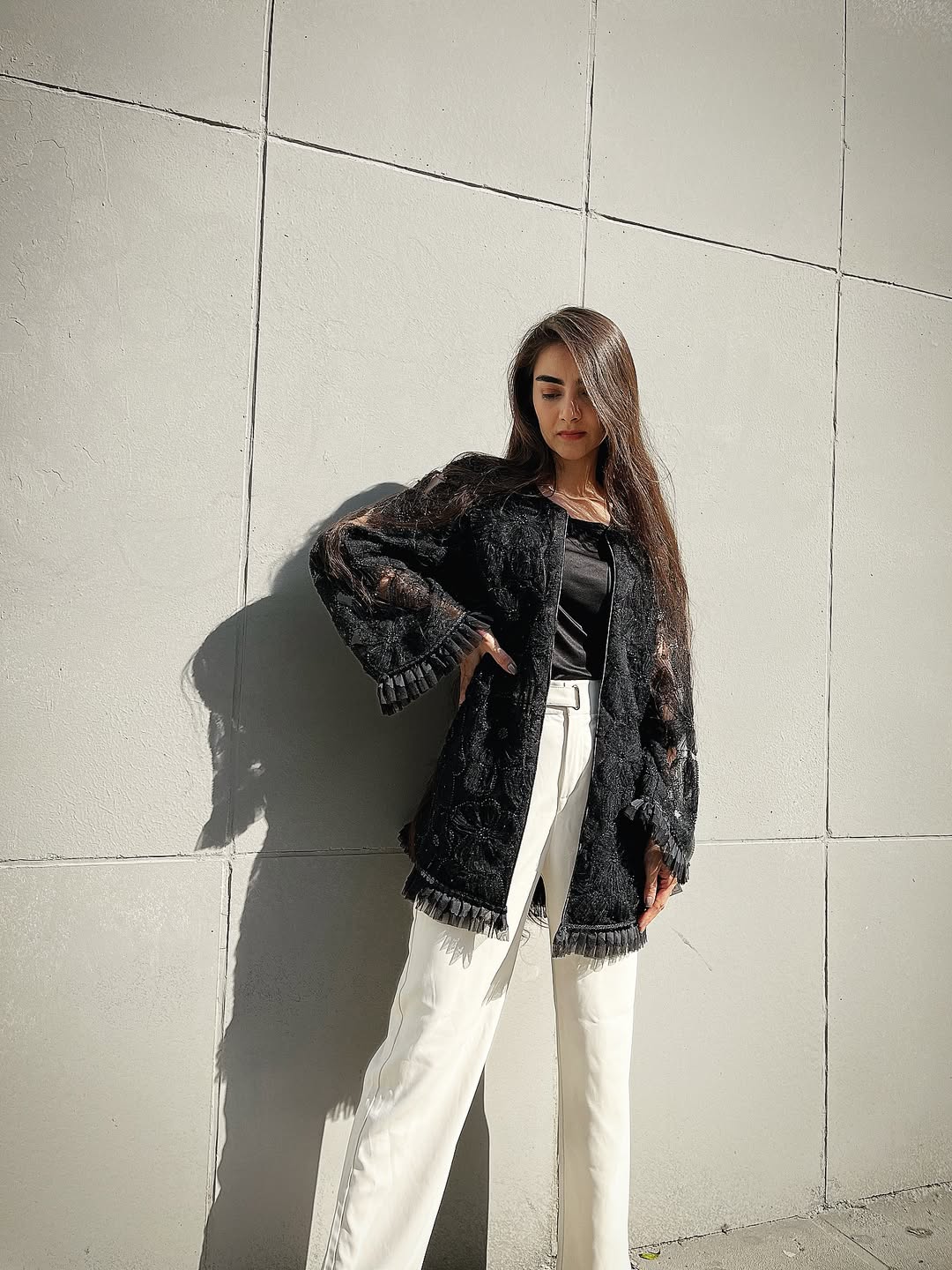 پمانتو کتی با طرح گل برجسته دوختهشده از پارچه ترک گل دوزی شده سبک، با بافت ظریف و درخشان. طراحی آزاد و خوشفرم این کت باعث میشه برای هر موقعیتی مناسب باشه — از قرار روزمره تا استایل رسمیتر.